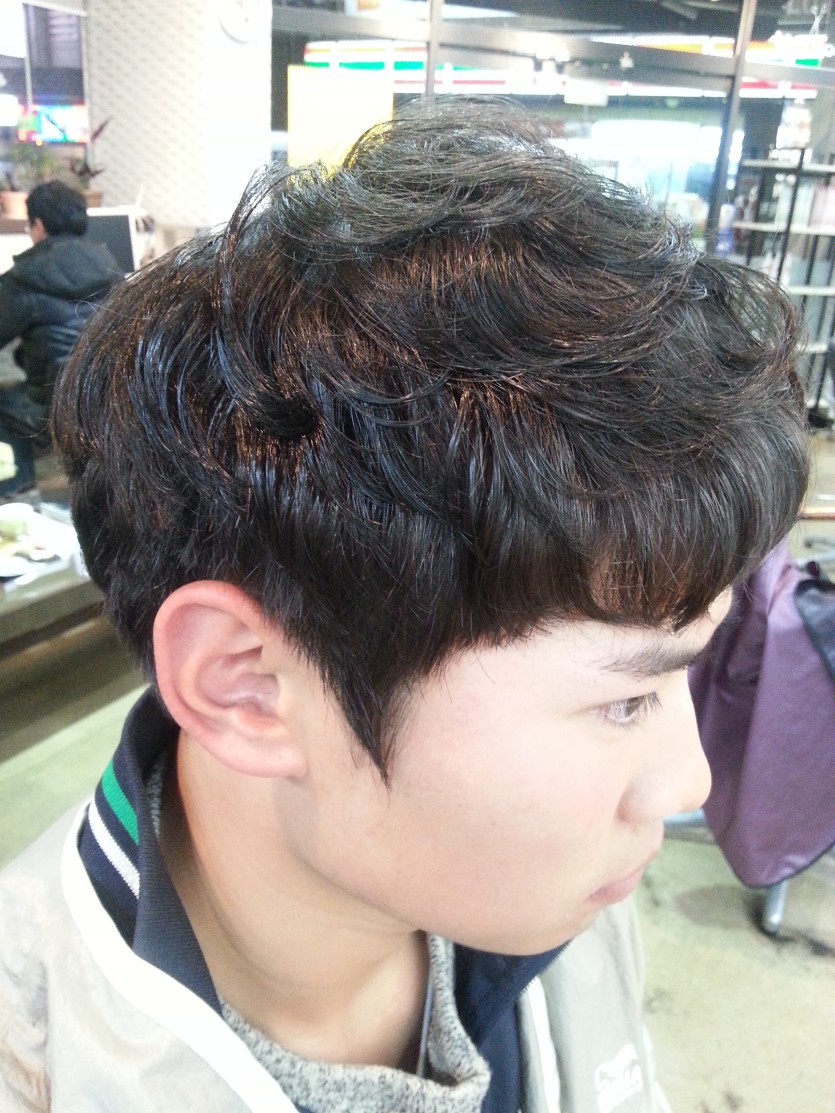모량이 많아 보이지 않게 옆머리보다는 탑부분을 강조한 스타일